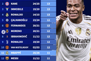 [流言板]本季五大联赛球员各赛事参与进球榜:姆巴佩和凯恩各43次